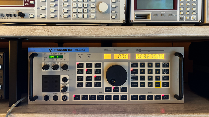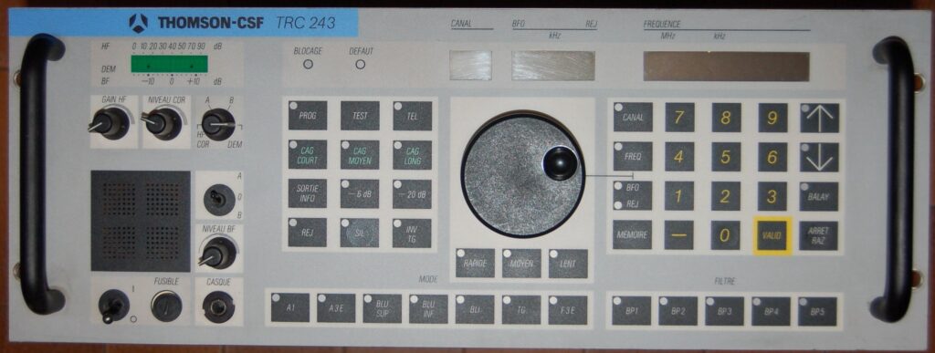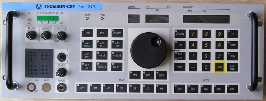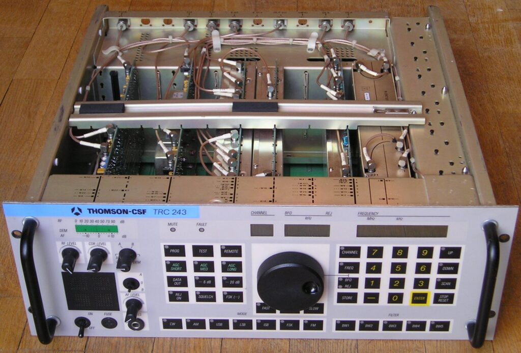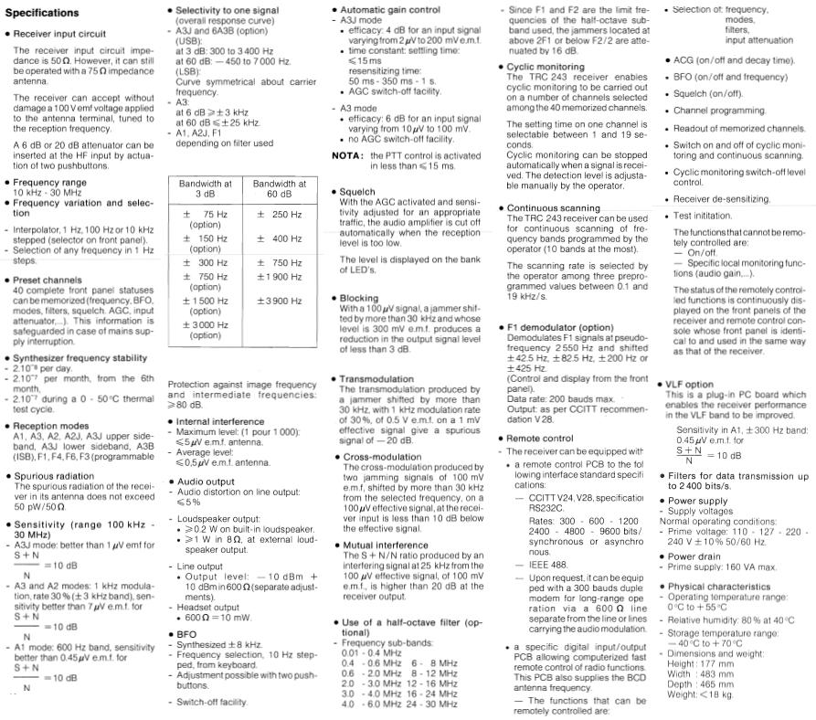 Il TRC 243 è un ricevitore HF a stato solido progettato attorno al 1986 che copre la gamma 10 kHz ~ 30 MHz nei modi AM,USB,LSB,CW,FSK,FM (ISB opzionale) in maniera continua a passi di 1 Hz. Sono a disposizione 100 allocazioni di memoria.